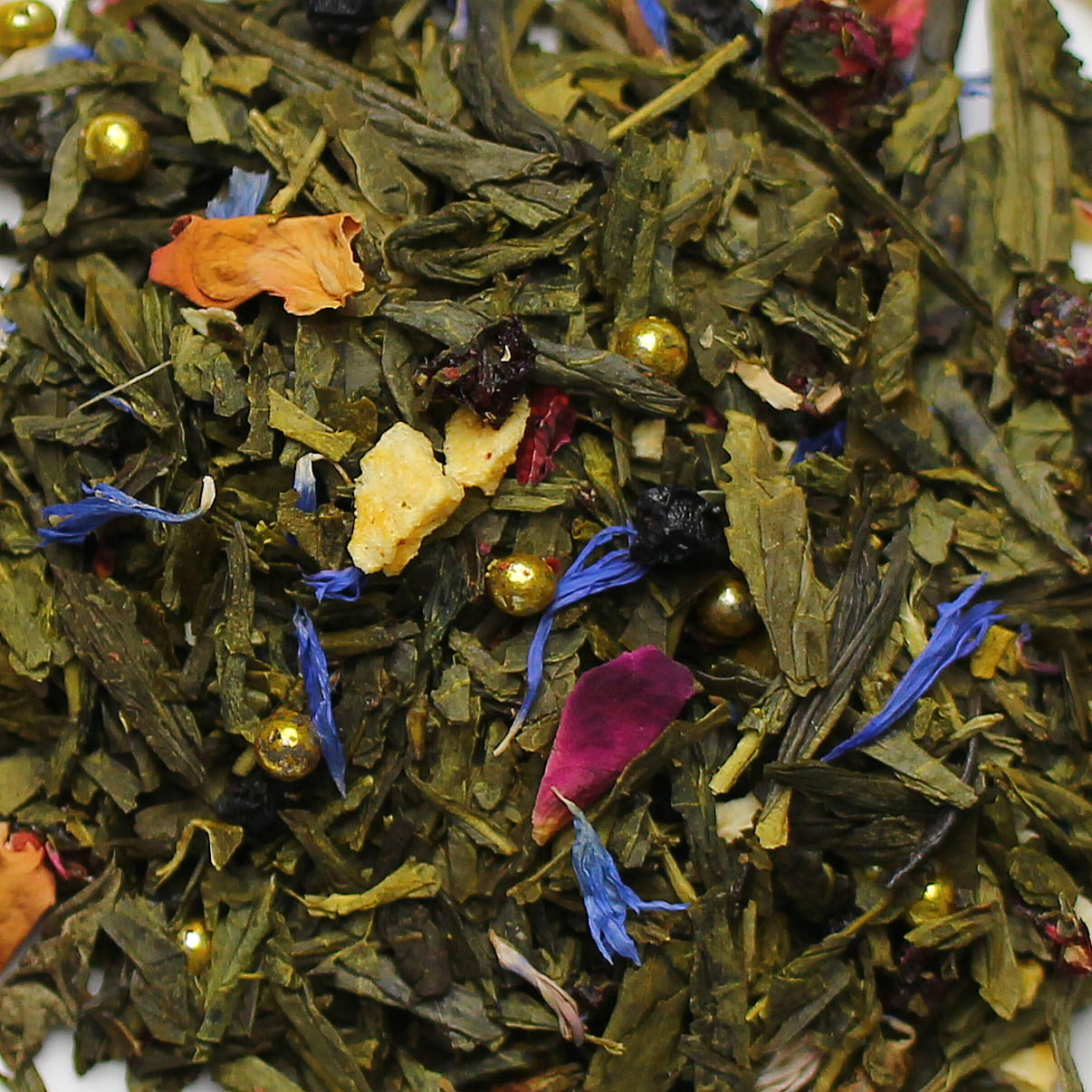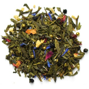 Skład herbaty: herbata zielona Sencha, suszone owoce czarnego bzu, złote cukrowe kryształki, brzoskwinia liofilizowana, wiśnia liofilizowana, aromat, płatki róży i bławatka.